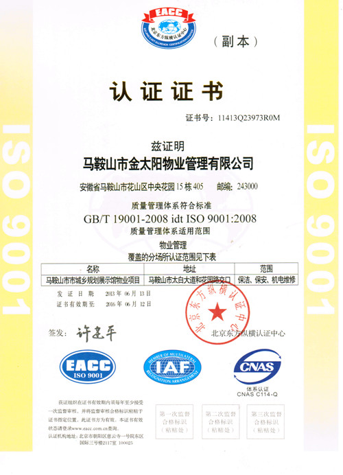 金太陽物業(yè)公司成功取得“三標(biāo)”管理體系認(rèn)證證書
